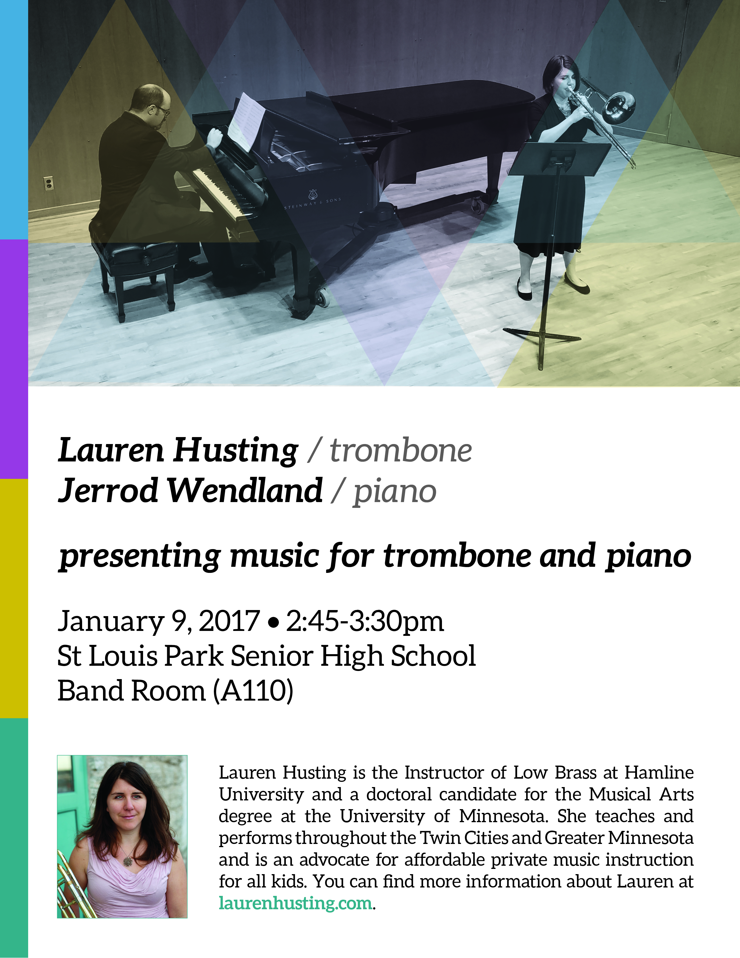 - Recitals by Natalie Mannix and Ava Ordmann, trombones (all music by female composers!), and Donna Parkes, trombone (AMAZING rendition of the Sulek)