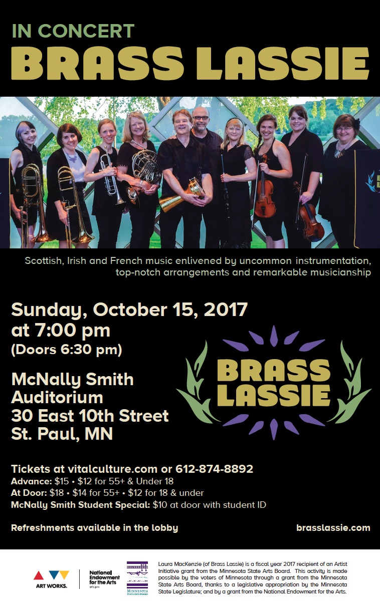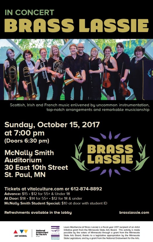 Sunday, October 15th, 7pm: The aforementioned Brass Lassie concert! Buy your tickets in advance for a discount.