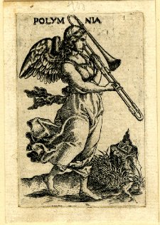 Here we see Polyhymnia, muse of sacred poetry and hymns, in her natural element as trombone player. This is from a series of engravings done by Franz Brun in the 1570s depicting all nine muses (1). Why would Brun choose to give Polyhymnia a trombone? At the time, trombone served a significant role in church ensembles, providing a strong compliment to vocal lines that in larger groups imitated the sound of organ. Even as it blended well with vocal lines and organ accompaniment, it did not obscure text or meaning in the way other instruments’ textures might, and was seen as a way of enhancing spiritual communication (2). Thus, our muse of sacred poetry and hymns would know her way around a trombone, the literal muse of the religious world.
